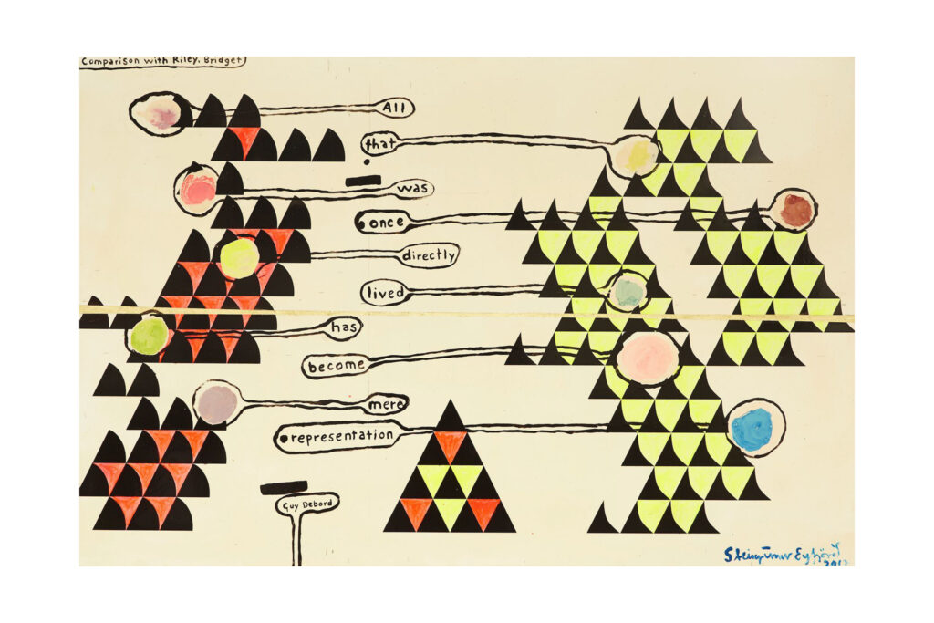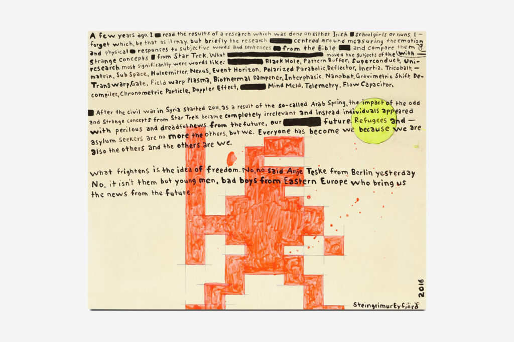 Steingrímur Eyfjörð presents his art as an ongoing conversations where different experiences and opinions clash and are explicated. The subjects can be gleaned from any available source and all seem to find a place in Eyfjörð’s discussion: Social issues, psychology, superstitions and pseudo-science, stories, art and literature. This is a dialectical method where the search for connections and understanding is a matter for discussion and eventual compromise between different perspectives, rather than being governed by a single, logical rule. The making and presentation of the works also seems to be a discussion between different approaches and media. While text has long played a major role, Eyfjörð has also made sculptures and installations, used illustrations and even cartoon formats, as well as both photography and video. As guests in his exhibitions we become part of this never-ending conversation.