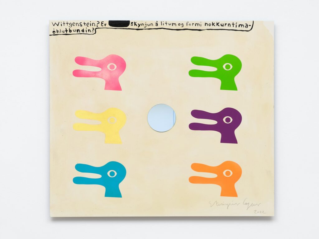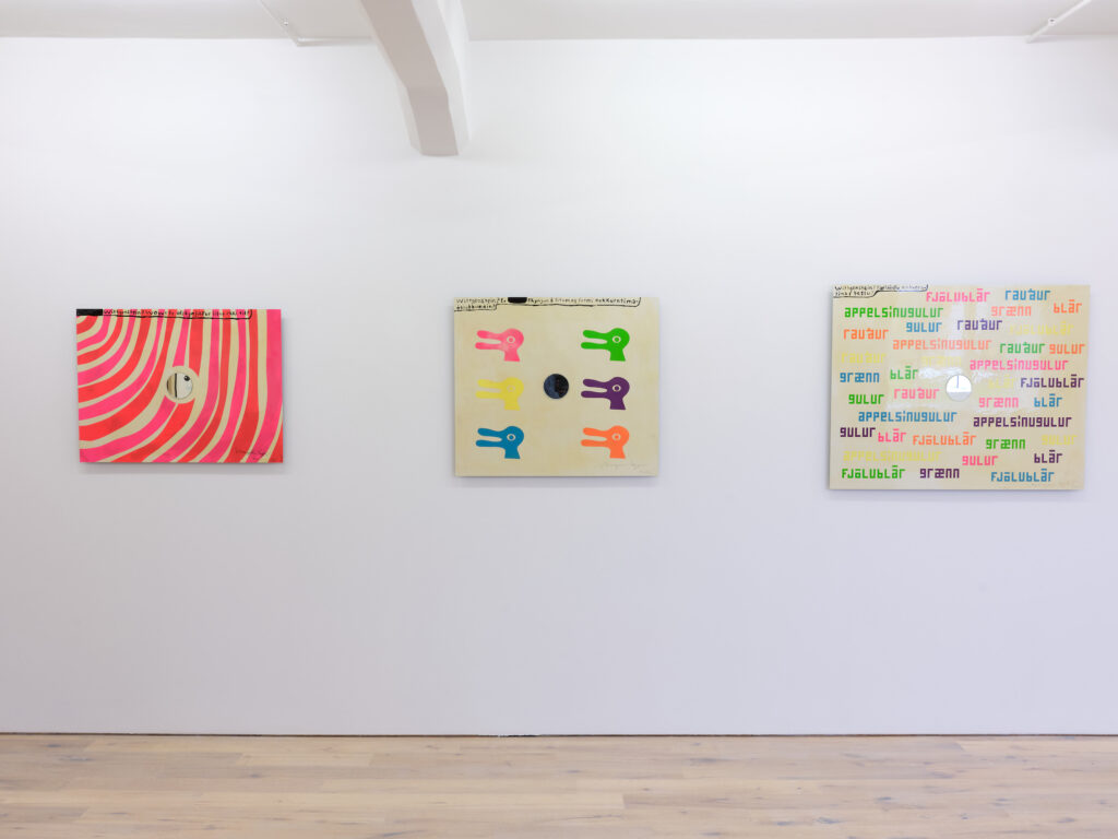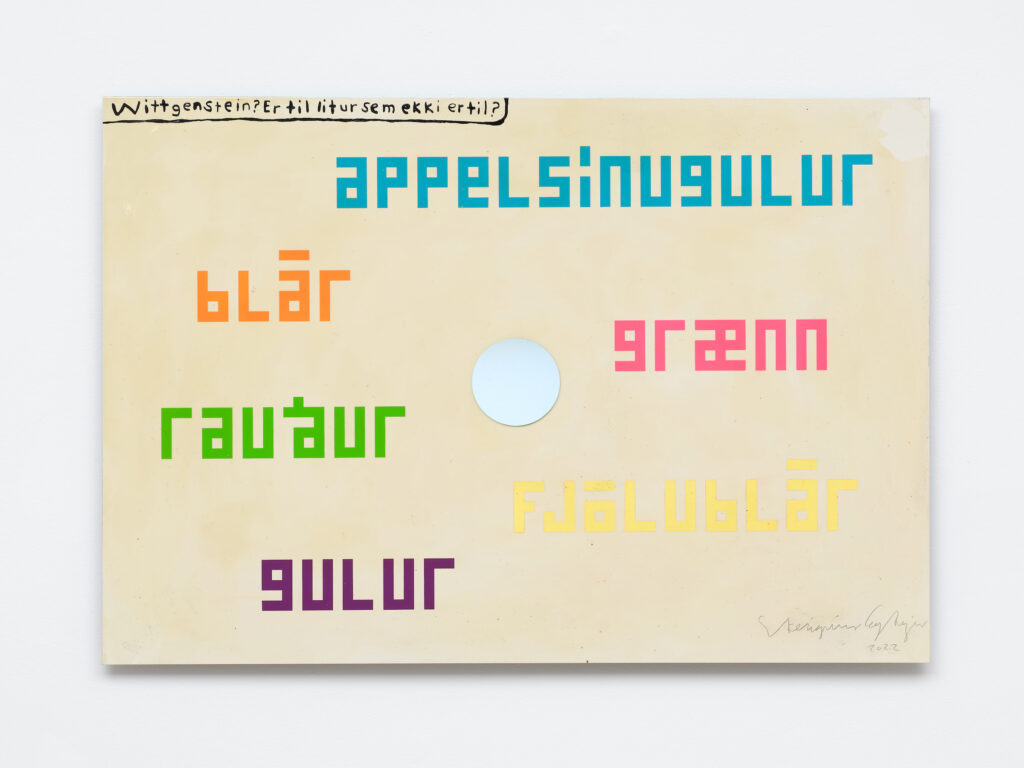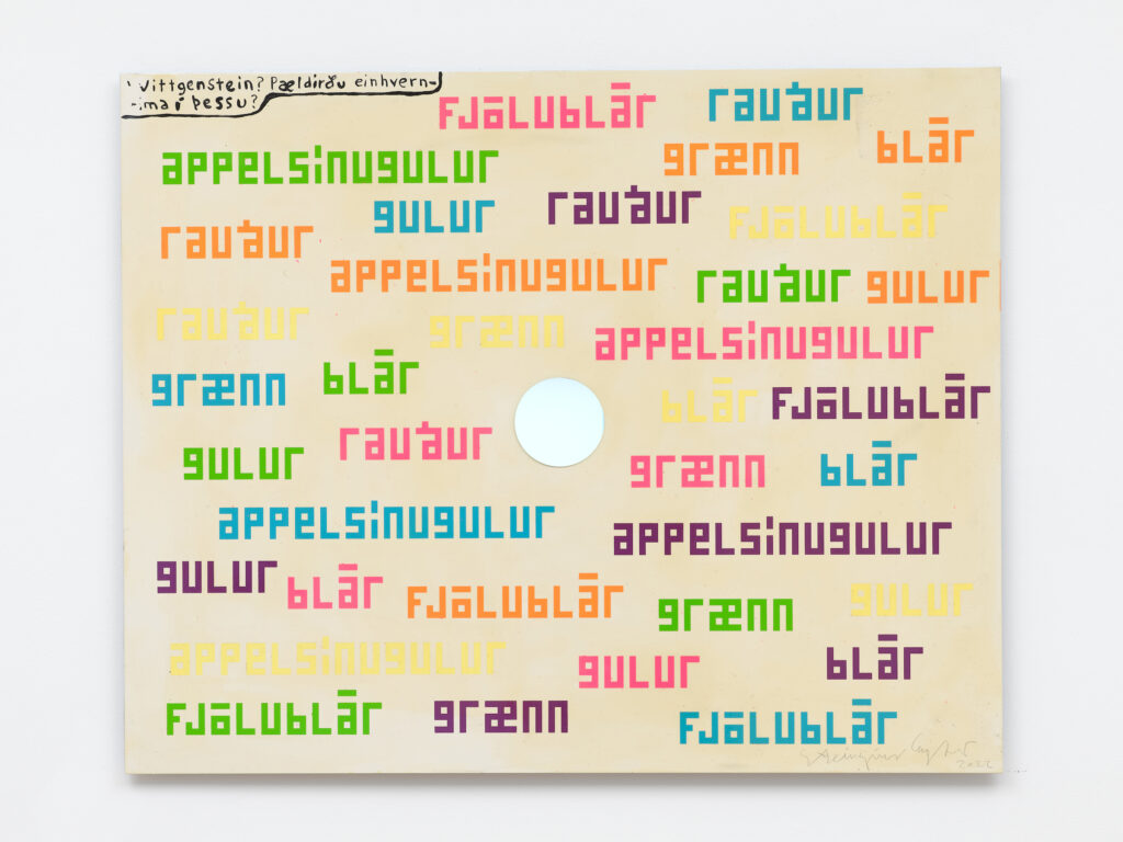 In the works of the exhibition, made in 2021-22, Eyfjörð is in dialogue with Wittgenstein, with Art itself as a phenomenon and with himself, about the fourth dimension, the perception of colour and the imagination as a force increasingly activated by humans through the growing development of visual technology. In many of his colourful works, there is a blindspot in the middle, as representative of the invisible colours and that which cannot be verbally described, and which none of us perceive in the same way.
