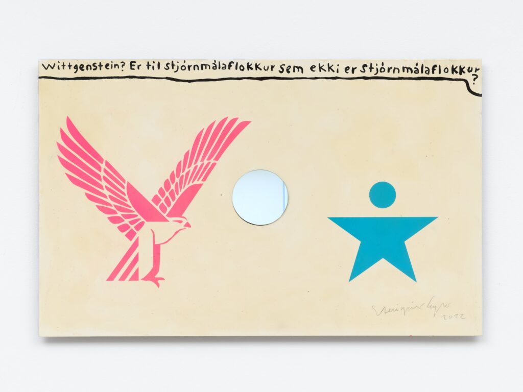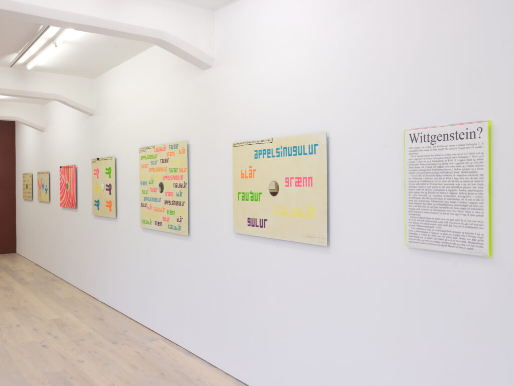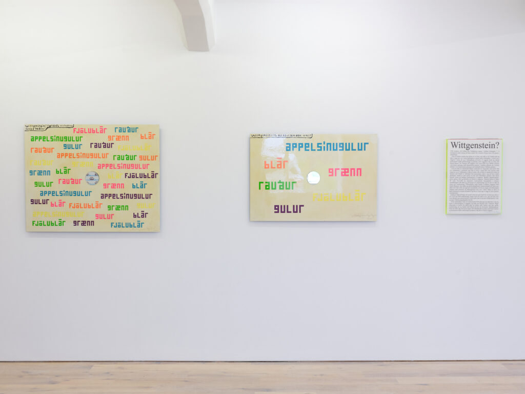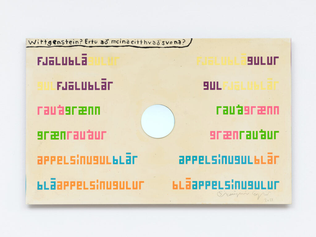 In Eyfjörð’s works in his exhibition Wittgenstein? and The Association of Living Folklore, fragments of texts and images refer on one hand to Icelandic folklore and on the other to the writings of philosopher Ludwig Wittgenstein, more specifically to his work, Bemerkungen über die Farben (Remarks on Colour), which he wrote a year before his passing, in 1950. In the book, Wittgenstein reflects in a fragmented manner on the relationship between our ability to see, the concept of colour and luminosity, language and our capacity to imagine, aspects that he had addressed throughout his career. He examines the “grey” area within which the mind takes over from what the eye perceives, from an image or from our environment, the colours we consider ourselves to be perceiving but are in fact our mental constructs.