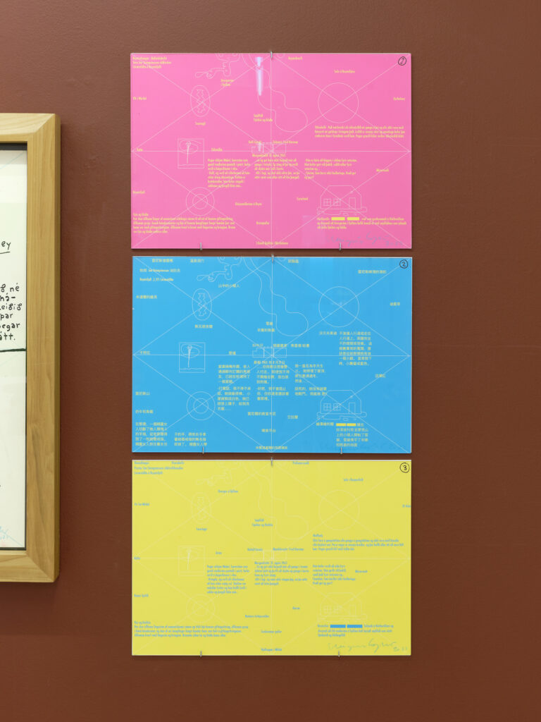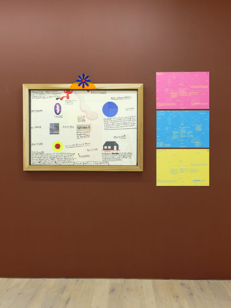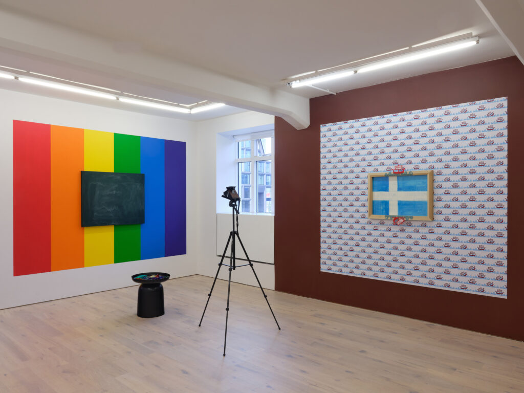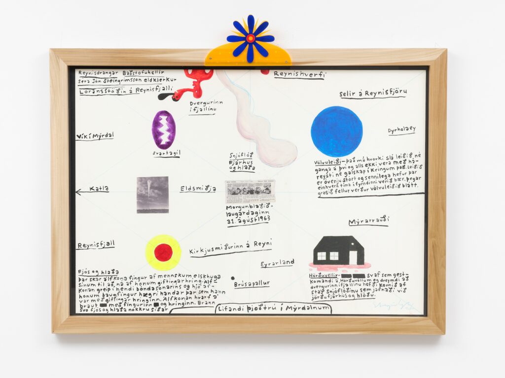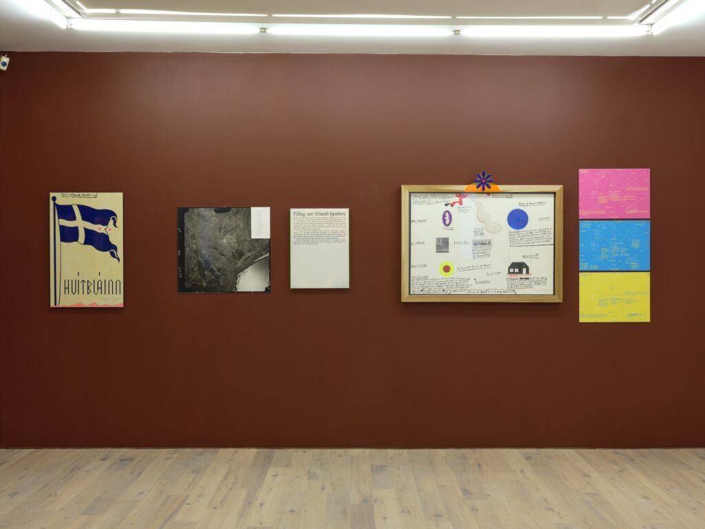 In Eyfjörð’s works in his exhibition Wittgenstein? and The Association of Living Folklore, fragments of texts and images refer on one hand to Icelandic folklore and on the other to the writings of philosopher Ludwig Wittgenstein, more specifically to his work, Bemerkungen über die Farben (Remarks on Colour), which he wrote a year before his passing, in 1950. In the book, Wittgenstein reflects in a fragmented manner on the relationship between our ability to see, the concept of colour and luminosity, language and our capacity to imagine, aspects that he had addressed throughout his career. He examines the “grey” area within which the mind takes over from what the eye perceives, from an image or from our environment, the colours we consider ourselves to be perceiving but are in fact our mental constructs.
