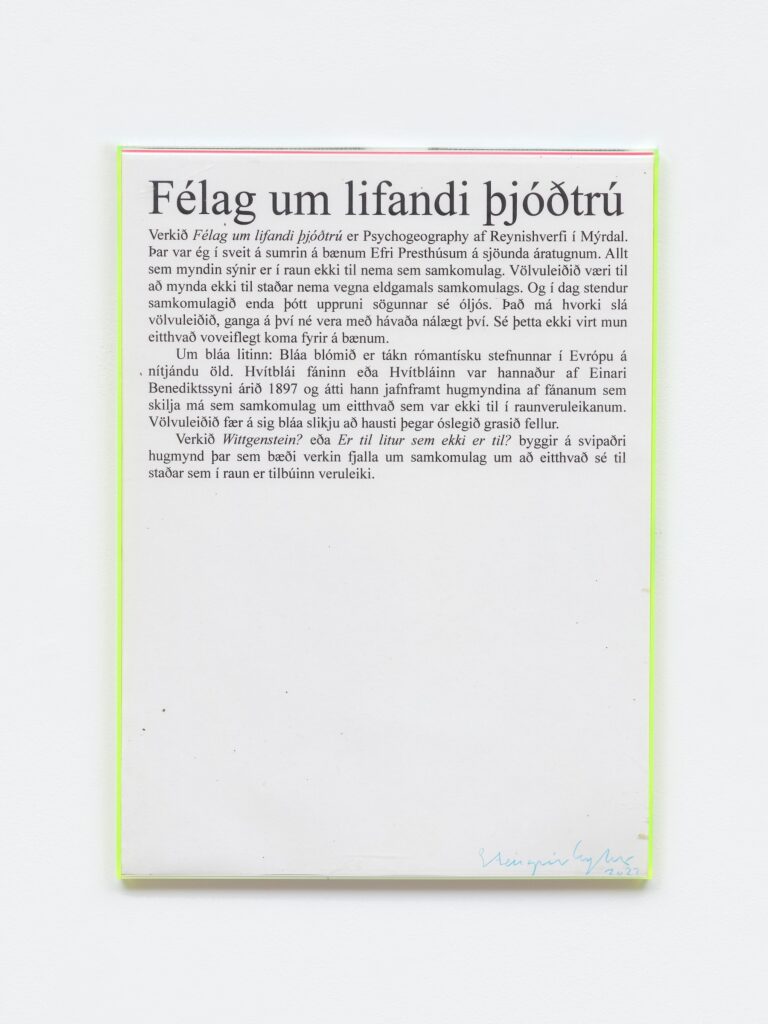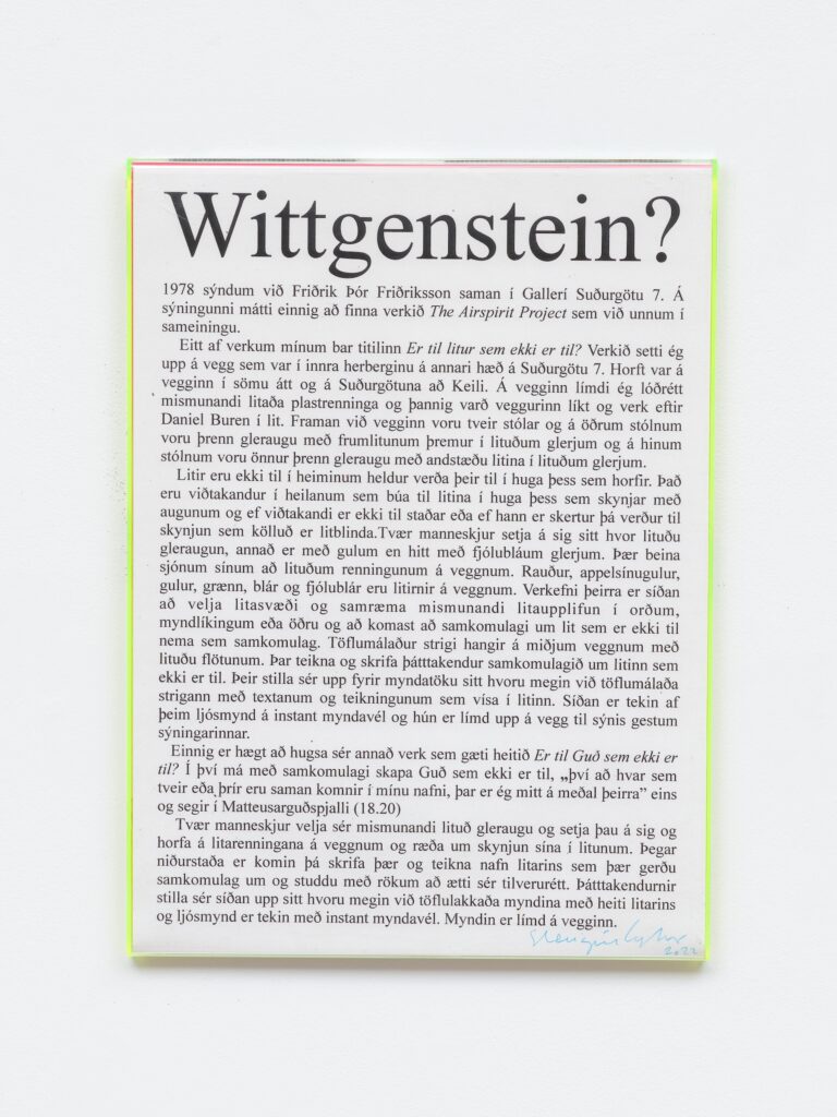 Along the lines of Wittgenstein, Eyfjörð asks, in his own work from 1978: “Is there a color that does not exist?” and connects such questions, past and present, to the common understanding of mankind that what exists can at the same time be a fabrication of our minds. This understanding brings him in relation to the living folklore and the spirit world that we might not see and only a few of us can sense. The work from 1978 was a participatory work, i.e. the experience of the work took place through looking and verbally describing that what one perceived until the dialogue between viewers led to a consensus on a color that does not exist.